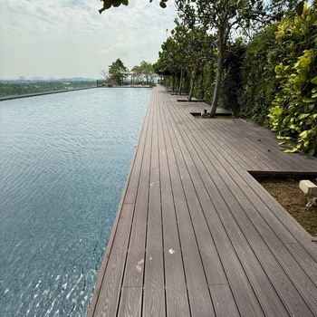 Tablero de cubierta de piscina WPC con canales de drenaje evita la acumulación de agua para un entorno seguro y seco junto a la piscina